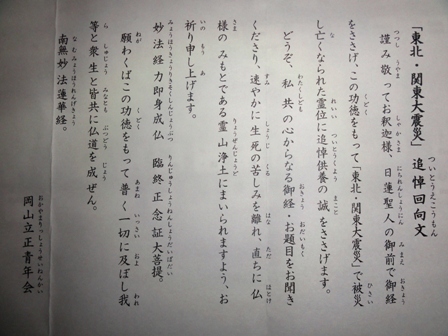 2011年03月27日(日) 住職ブログ 春季彼岸法要 この度の法要では3月11日「東北関東大震災」でお亡くなりになられた多くの精霊への追善供養も併せて行ないました。未曾有の大地震と津波にのまれ、その苦しみと無念の思いを想うと本当に心が痛みます。法要終盤、岡山立正青年会で作成した「追悼回向文」を全員で読み、心よりご冥福を祈りました。大勢のお参り誠に有り難うございました。お手伝いご奉仕いただいた総代、役員、婦人部の皆様、本当にお疲れ様でした。有り難うございました。