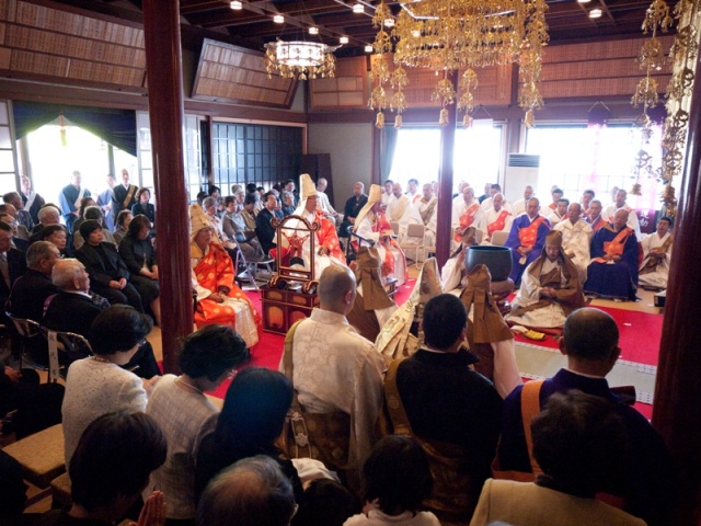 2010年07月18日(日) 住職ブログ 法燈継承式写真 4月の法燈継承式のスナップ、記念写真は三愛さんにお願いしましたが、それとは別に先日、司会をお務めいただいた太然寺の大野上人より画像をいただきました。今回、画像を大きく(半切サイズ)に引き伸ばしました。特殊なレンズで撮っていただいたようで、全体の雰囲気がよく分かります。