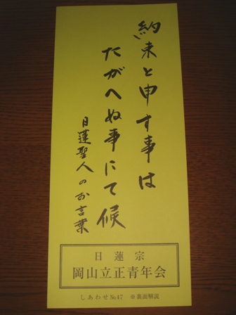 まずは?教箋しあわせ、「きょうせん〜」と読みますが、日蓮聖人のお言葉を記したもので、目につくところに貼るものです。(岡山立正青年会が発行したものです)