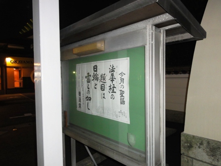 今日ふと目にした本に「寺の門前の掲示板にはその寺の住職のやる気が表われる…」と書かれてました。「やる気」とは平生からの布教、教えを説くことへの意欲でしょうか。