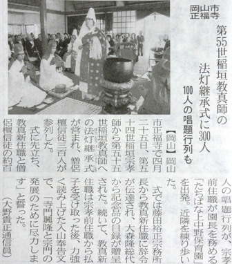 2010年09月06日(月) 住職ブログ 日蓮宗新聞に… 遅ればせながら8月の日蓮宗新聞に当寺の法燈継承式の記事が掲載されました。通信員の方から取材を受けましたが、紙面の都合で記事が若干カットされているようです。日蓮宗新聞をとってられる人は少ないのでこのブログにて紹介させていただきます。(少々お恥ずかしいですが…)