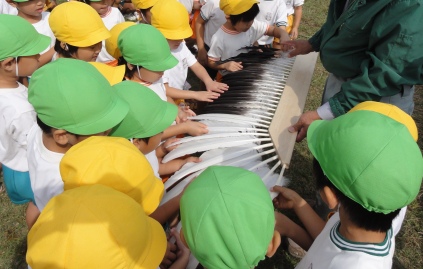 2010年10月18日(月) 住職ブログ 秋の遠足〜岡山県自然保護センター 飼育係の人に「タンチョウ鶴」の生態について説明を受けました。これは実物の羽根を使った模型です。大きな羽根に園児らも興味津々の様子ですね。