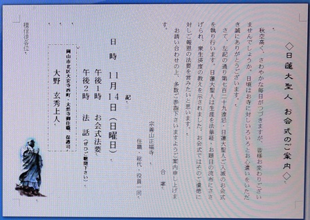 本日はお会式の案内を配布しました。お誘い合わせの上、多数のお参りをお待ちしています。