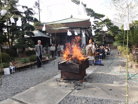 2010年12月18日(土) 住職ブログ お火焚き祭 お火焚き祭が行なわれました。古いお札や塔婆、仏具(燃えるもの)を各檀家が持ち寄り、読経しながらお焚き上げをしました。今年は風の影響も少なく無事済ませることが出来ました。毎年この行事がくると1年の終わりを実感します。そしてこの行事が終わると新年に向けての準備が本格的に始まります。