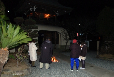 除夜の鐘の様子です。甘酒が接待され、たき火で暖をとります。年越しから1時すぎまでお参りが続きました。