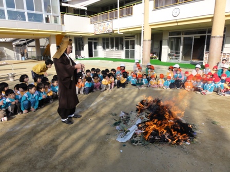 2011年01月14日(金) 住職ブログ とんど焼き・小豆がゆ たちばな上中野保育園では小正月を前に園児たち各家庭の正月飾りを持ち寄り「とんど焼き」を行いました。はじめに園長(院首)と私が読経祈念を行いました。