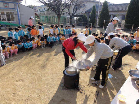 小豆がゆの様子。鏡開きのお餅も入れ一年の健康を祈り美味しくいただきました。