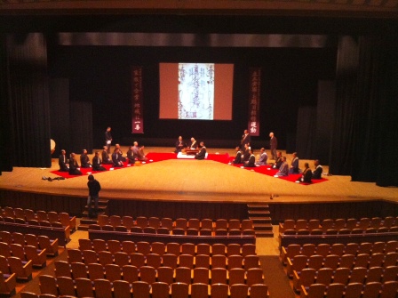 2011年03月10日(木) 住職ブログ 聞法のつどい 前日準備 岡山市民会館では音楽法要に向けてのリハーサルが行なわれていました。途中から明日、講演予定の清水海長寺貫首・菅野日彰猊下も加わられ、唱題行を交えた法要の入念な打ち合わせが行なわれました。