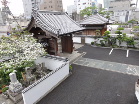 善学寺、本堂(2階)より山門を望む。境内がアスファルトに変わっていました。昨年の善学寺入退山の記念事業のようです。雨の後は楽そうですね。