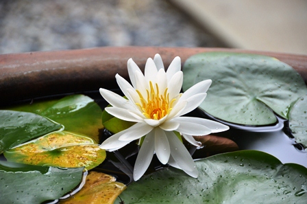2011年06月27日(月) 住職ブログ 睡蓮開花です この数日法務が多忙を極めブログをさぼってしまいました。今朝もそんなとき、母から「睡蓮咲いてるよ、ブログにのせるんでしょ」と一言。そう言われると載せないわけにはいきませんね。カメラを持って駆け足で本堂前へ・・・。平成16年にお檀家の大森常良さんに水瓶と数株の睡蓮をいただきました。手入れ等はとくにしていませんが、以来毎年美しい花を付けてくれます。当ホームページの表紙のフラッシュでもおなじみのものです。
