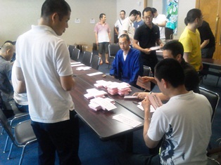 青年会では年に1回教箋(きょうせん)という日蓮聖人のお言葉を記したものを発行しています。岡山県下約130ほどの各寺院の檀家数(?)に合わせて仕分けしました。