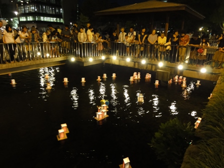 2011年08月16日(火) 住職ブログ 納涼の夕べ〜灯籠流し 日が暮れ、川面にゆれる無数の光は、ご先祖さまの御霊(みたま)そのもののようで、多くの人たちがいつまでも故人を偲び、頭を垂れ手を合わせる姿が印象的でした。お手伝いのお上人方、お参りの皆様ご苦労様でした。