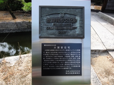 大賀家はもともと畳表の取引を江戸と直接行っていた商屋で、主屋の他に離座敷、2階座敷、内蔵、土蔵など江戸後半から明治中期に建てられた、どれも歴史ある建造物が建ち並んでいます。また庭瀬藩別邸から移築されたという立派な庭もありました。