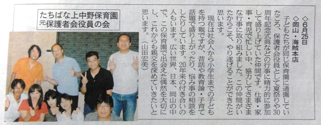 2011年09月28日(水) 住職ブログ 山陽新聞の「つどい」欄に… 月曜日(26日付)の山陽新聞「つどい」欄に以前、たちばな上中野保育園の保護者会で役員としてお世話になった方たちの写真が掲載されました。皆さん変わらずお元気そうですね。保育園にもまたお顔を見せて下さい。