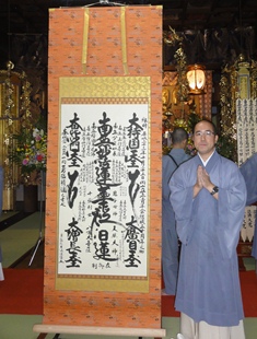 記念事業の一つとして宗蓮寺・垣本孝精上人により大曼荼羅御本尊が揮毫されました。これほど大きなお曼荼羅は他に多くは存在しないのではないでしょうか。