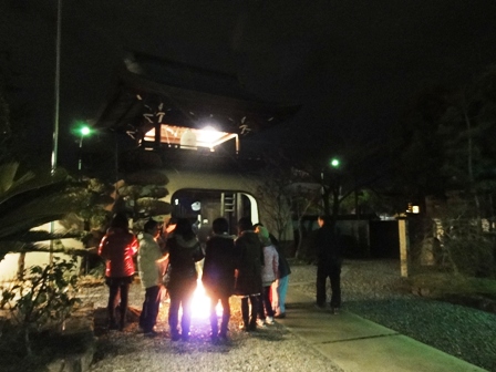 平田の藤澤婦人部会長からいただいた甘酒をお参りの方に接待しました。この甘酒は毎年好評で各々たき火で暖をとりながら飲まれて行かれます。
