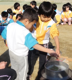 こういう特別な行事を行なうと園児らの表情がさらに生き生きとするようで、慣れない手つきで野菜を切ったり、釜に入れたりするのはとても貴重な体験です。家庭では「七草がゆ」を食べることも少ないでしょうからなおさらですね。