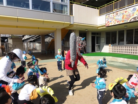 保育士が扮した赤鬼、青鬼の登場に子供たちの大きな歓声が起こりました。子供たちは自作のお面をかぶり豆をまきました。
