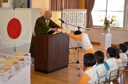2012年03月27日(火) 住職ブログ 平成23年度卒園式 卒園児49名を中心にその保護者、来賓、職員、在園児が見守るなか卒園式が始まりました。一同揃って厳粛な雰囲気のもと「君が代」を斉唱した後、園長挨拶と卒園証書を授与。園長(院首)から卒園する園児一人一人に証書が手渡されました。引き続き、大元小学校校長先生を始めとする皆様から温かなご祝辞をいただき、お別れの歌、園歌を歌い閉式となりました。