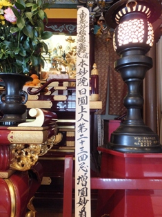 2012年04月29日(日) 住職ブログ 先々代23回忌 先々代・本妙院日圓上人の23回忌をごく身内のみで営みました。日圓上人は旧宗善寺と旧正福寺の合併、お寺の現・上中野への移転、大荒行堂通算800日成満、橘今保育園、橘上中野保育園の創立・・・等々、数多くの事業を成し遂げられ、当寺の護持発展に力を注がれました。そうの功績から当山では日圓上人を「中興開山」としています。その偉業を汚さないように、私も気を引き締めて当山の護持に精進することを誓い、心より増圓妙道をお祈りしました。 合掌