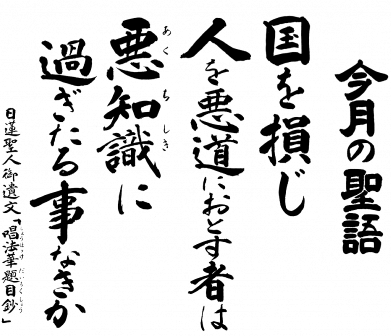 2012年05月03日(木) 住職ブログ 今月の聖語 毎月1日に門前の掲示板に「今月の聖語」を取り替えています。この聖語は日蓮宗新聞社から送られてくるもので、日蓮宗寺院では同じように掲示されているお寺も多いようです。ただどれだけの方の目に止まっているかは分かりませんが、最近よく掲示板の前に立ち止まり、聖語に添えられた解説文を読んでいる方を見かけます。今月の聖語ではありませんが、人々の心が悪に染まらないよう、ささやかですが一助になればと思います。