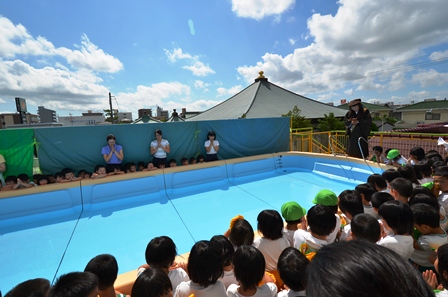 2012年07月10日(火) 住職ブログ プール開き たちばな上中野保育園では園児たちが待ちに待ったプール開きが行われました。幸い梅雨の晴れ間となり、絶好のプール日和ですね。まずは院首(園長)による園児の安全祈願、そして諸注意を行いました。