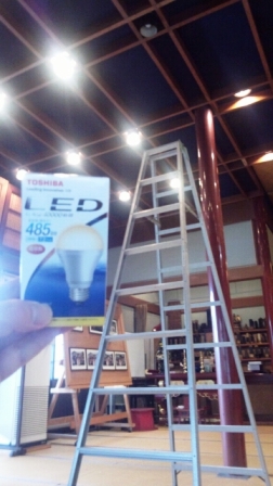 2012年05月28日(月) 住職ブログ LED化 本堂、鬼子母神堂は天井が高く白熱電球が合わせて約100個使われています。ですので結構頻繁に電球が切れ交換を行っています。交換するときは毎回約3メートル(!)という高い脚立を使わなければならず・・・登る度に落ちないかいつも冷や冷やしています( ̄ー ̄;そこで、切れたものからLED電球に交換しています。すべて交換するにはまだまだ時間がかかるでしょうね。