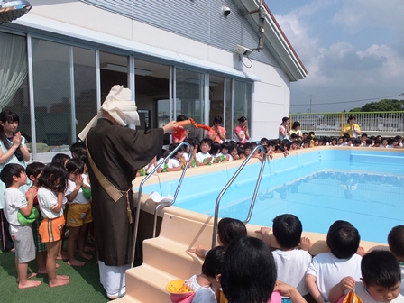 2012年07月10日(火) 住職ブログ プール開き 園児らも早く水に入りたくて待ち遠しいようですが、静かに手を合わせ共に祈りました。たちばな上中野保育園では園のプールで8月末まで遊びますが、この他、4,5歳児の園児らは11月いっぱい近くのスイミングスクールにも通い指導を受けています。