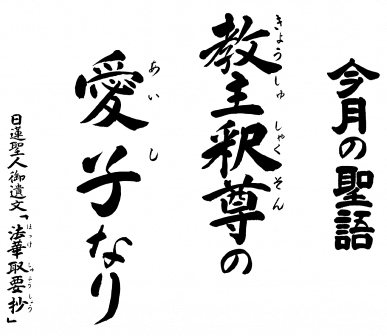 法華経には永遠の命をもって衆生済度を願われた教主釈尊(久遠本仏)が説かれまていす。そして、私たち一人一人が等しく釈尊の愛子である・・・・。釈尊は我が子を見守るがごとく、慈悲の心で常に私たちに寄り添われているのです。南無妙法蓮華経。