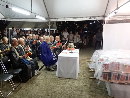 2012年08月17日(金) 住職ブログ 納涼の夕べ〜灯籠流しH24 法要の様子。読まれるお経は「妙法蓮華経・観世音菩薩普門品第25」、いわゆる「観音経」です。私たちに馴染み深いお経が各宗派共通のお経になっています。耳に馴染んで心地いいですね。