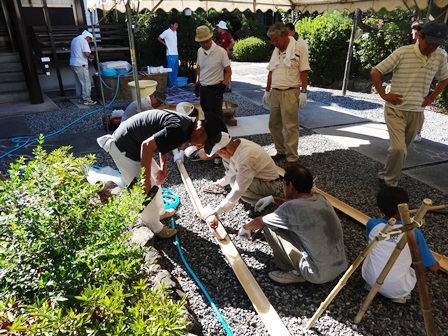 2012年08月25日(土) 住職ブログ 前日準備 まだまだ残暑が厳しいですが、午後から明日の本番を前に前日準備が行われました。約20名の檀信徒青年会の会員がテントを張り、そうめん流しと受付関係の準備、また食品、物品の購入を中心に行いました。それぞれ得意分野をいかし知恵を出し合いながら一つ一つ作業を進めました。
