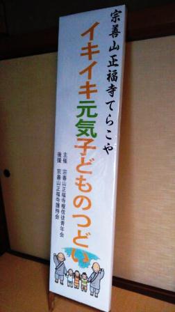2012年08月24日(金) 住職ブログ 看板も・・・ 26日の「イキイキ元気子どもつどい」も開催間近になっていろいろと各方面の方々のお力を借りながら準備を進めています。看板も最初「そこまでは・・・」という消極的な気分でしたが、結局、方向転換。出来には個人的に満足しています。さて、明日25日(土曜日)は前日準備です。檀信徒青年会の皆様、よろしくお願いします!