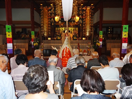 当寺では春の彼岸法要で建立したお塔婆を一時しまって取っておき、再び秋の法要でならべて供養します。その後、お塔婆は10月の「川施餓鬼」に持参し海岸等で施餓鬼供養を行いながらお焚き上げしています。