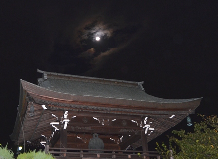 2012年09月30日(日) 住職ブログ 中秋の名月 大型台風17号のため今晩の中秋の名月はあきらめていましたが、幸い雨も上がり、8時過ぎ、子供らとともに庭へ出てみました。すると、流れる雲間から何度か顔をのぞかせてくれました。本当にきれいな満月でした。10時半頃、再度、カメラと三脚を片手に庭にでましたが、今度は夜空一面薄雲に覆われ月は見えませんでした。また少し降るのでしょうか。