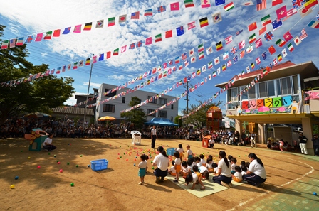 2012年10月14日(日) 住職ブログ 元気いっぱい!運動会 2歳児の園児による玉入れ。テーマは鬼ヶ島に鬼退治出発!ということできび団子に見立てたボールをお共の犬やサル、キジの口に入れるといったもの。元気に鬼ヶ島へ出発できたようです。