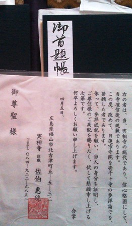 2012年10月15日(月) 住職ブログ 千ヶ寺参り 先日、全国日蓮宗寺院を千ヶ寺巡っておられる男性2人が来寺されました。お預かりしたご首題帳には本人の名刺に加え菩提寺(福山・実相字)住職による身分証明まで添えてありました。当寺がご首題を記す頁の左下には900番台の数字が書き込まれていて、目標の千ヶ寺もあと少しのようでした。3月にも当寺に別の方が参られたことがありますが、どなたもご高齢のお方でしたが、その意欲と信仰の深さに頭が下がります。短い時間ではありましたがいいご縁をいただきました。見習いたいものですね。