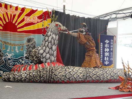 古代出雲歴史博物館前の特設会場内のテントで行われていた八岐大蛇退治の神楽を観ました。予想以上の迫力に驚きました。
