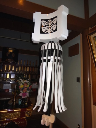 2012年12月05日(水) 住職ブログ 纏(まとい) 日蓮宗岡山県宗務所・宗務所長と伝道担当事務局スタッフの皆様が自作された、まさに渾身の「纏(まとい)」です。当寺本堂にも1基飾らせていただきました!「本堂になぜ纏(まとい)が!?」不思議に思われるかたも多いでしょうね。東京の大本山池上本門寺では日蓮聖人への報恩お会式のお逮夜には100を超える万灯講中が練り歩きます。各講中が鉦や笛、太鼓の軽快なお囃子リズムで練り歩き、約30万人という人出で賑わいます。その万灯行列の先頭をいくのが纏です。各講中が纏を振り勇壮さを競い合います。