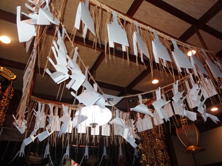 2012年12月29日(土) 住職ブログ 幣束の張り替え 今日から掃除と並行してお正月の飾り付けと各所セッティングを始めました。はじめに昨日、お檀家さんにきれいに掃除していただいた鬼子母神堂の幣束の張り替えです。一年に1回張り替えていると、遠くから見た限りでは色の変色も少なくあまり代わり映えもしないようですが、やはり新しいものにすると気も引き締まり、お堂全体の空気も変わった気がします。新たな年を迎えるにあたり、新しい幣束で道場を荘厳し、正月初祈祷会には当山霊宝・鬼子母大尊神ならびに山内守護の善神をお迎えします。皆様のお参りをお待ちしています。
