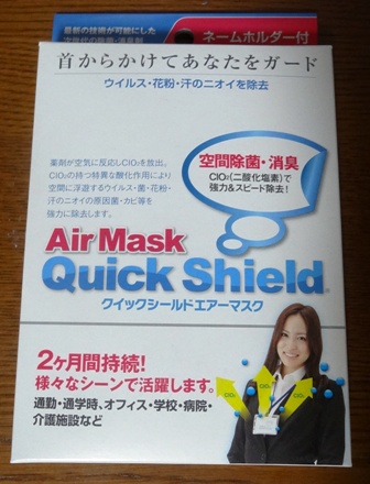 そこで、先日あるテレビ番組で新しい花粉症対策として紹介されていた「クイックシールド・エアーマスク」がホームセンターで売られているのを見つけ、さっそく購入してみました。