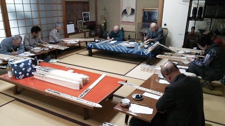 事前に各地区でお申し込みいただいた塔婆を地区ごとの総代・役員の皆様で手分けして書かれます。