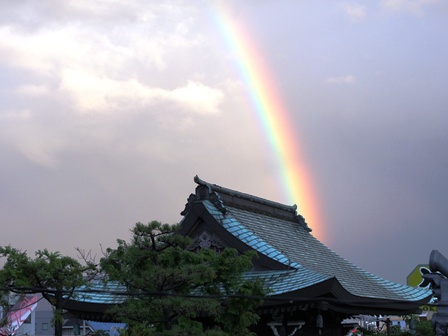 2013年06月15日(土) 住職ブログ 恵みの雨と虹 今日は予報とは違って一日雨がよく降りました。保育園では参観日がありましたし、法事でお墓参りもあったので少々困りました。とはいえ雨不足のことを考えるとまさに恵みの雨といった感じです。庭の植物も元気に蘇った感じがします。夕方には一時、雨が上がり鐘楼門にきれいな虹がかかっていました。