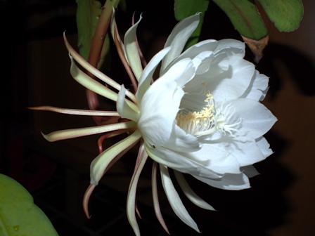 2013年07月14日(日) 住職ブログ 月下美人 暗くても夜行性の虫たちに見つけやすくするために目立つ白く大きな花を咲かせ、強いにおいをはなち、受粉しやすくするため雄しべとと雌しべは長く伸びているのだそうです。