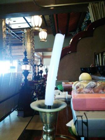 連日の猛暑がせいでしょうか、本堂のロウソクがこんな状態に・・・。どのロウソクもお辞儀をするように曲がっています。分かりますか?