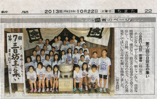 昨日、22日付山陽新聞朝刊の「集い」ページに宗蓮寺様の「三日坊主の集い」の写真が掲載されていました。
