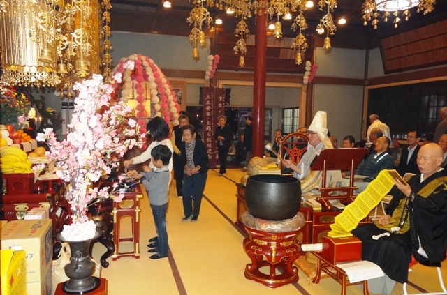 お会式とは簡単に言えば日蓮聖人の年回法要ですから、しめやかに、地味に行なうものと思われますが、実際には桜の花を飾り、色鮮やかに飾り付けをします。