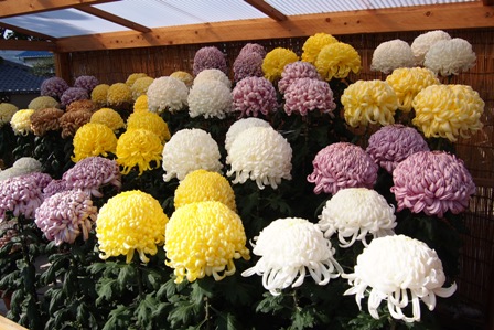 2013年11月11日(月) 住職ブログ 色とりどりの菊 先日、宗務所のお手伝いに太然寺様にお伺いしましたが、本堂前、客殿前に見事な菊が咲き誇っていました。菊に関してはまったくの素人で分かりませんが、それでもその美しさに思わず写真を撮らせていただきました。毎年、お檀家の方が奉納されるそうで、本堂前には檀信徒青年会による小屋も建てられ本格的です。明後日、13日はお講巡りがありますので太然寺様にお参りがてら観賞されてはいかがでしょうか。