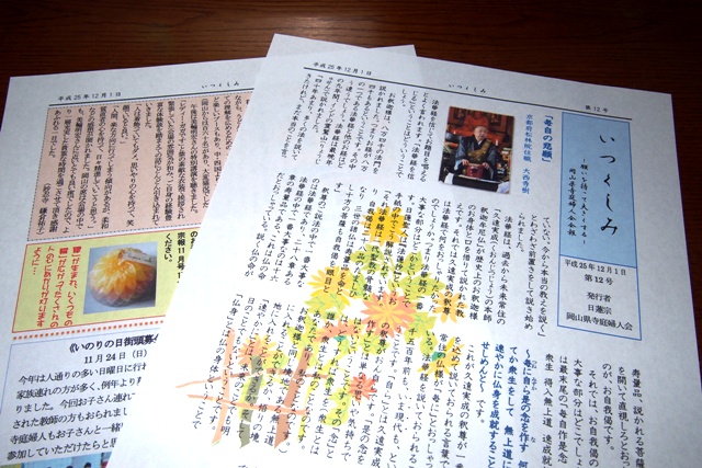 2013年12月09日(月) 住職ブログ いつくしみ第12号 先日、岡山県寺庭婦人会の会報が届きました。年2回の発行で今回で12号だそうです。毎回、寺庭婦人会の活動報告、コラム、食事のレシピ、仏事解説などバラエティーに富み分かりやすく書かれていて、とても勉強になります。当寺でも寺報を発行していますが、「いつくしみ」を参考に昨年よりカラー紙面に変更しました。宗務所ブログで詳細を読むことが出来ます。ぜひご覧下さい!こちらへ
