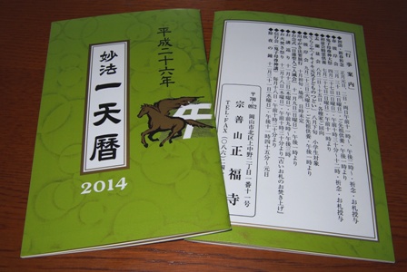 2013年12月14日(土) 住職ブログ 来年の暦 平成26年の暦(こよみ)が出来上がりました。裏面には主な年間行事も記載されています。お檀家の皆様へは20日頃から正月の案内と共に1部ずつお配りいたします。これを手にすると来年の運勢などいろいろと気になりますね。ちなみに先代院首は来年年男ですが四緑で八方塞がり・・・運勢は良くないようで、昭和50年生まれ七赤の私も良くありません。何事にも慎重にいくのが良さそうですね。