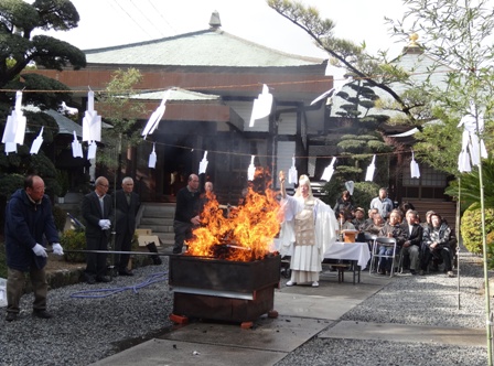2013年12月19日(木) 住職ブログ お火焚き祭 年末恒例のお火焚き祭が執り行われました。この度は昨日の雨で1日延期しましたが、朝からすっきりとしない曇り空で、小雨も一時降ったりして心配しましたが、何とか天気も回復し無事行うことができました。お参りも減るかと心配していましたが、風もなく暖かな気候のもと例年通り大勢のお檀家にお集まりいただきました。